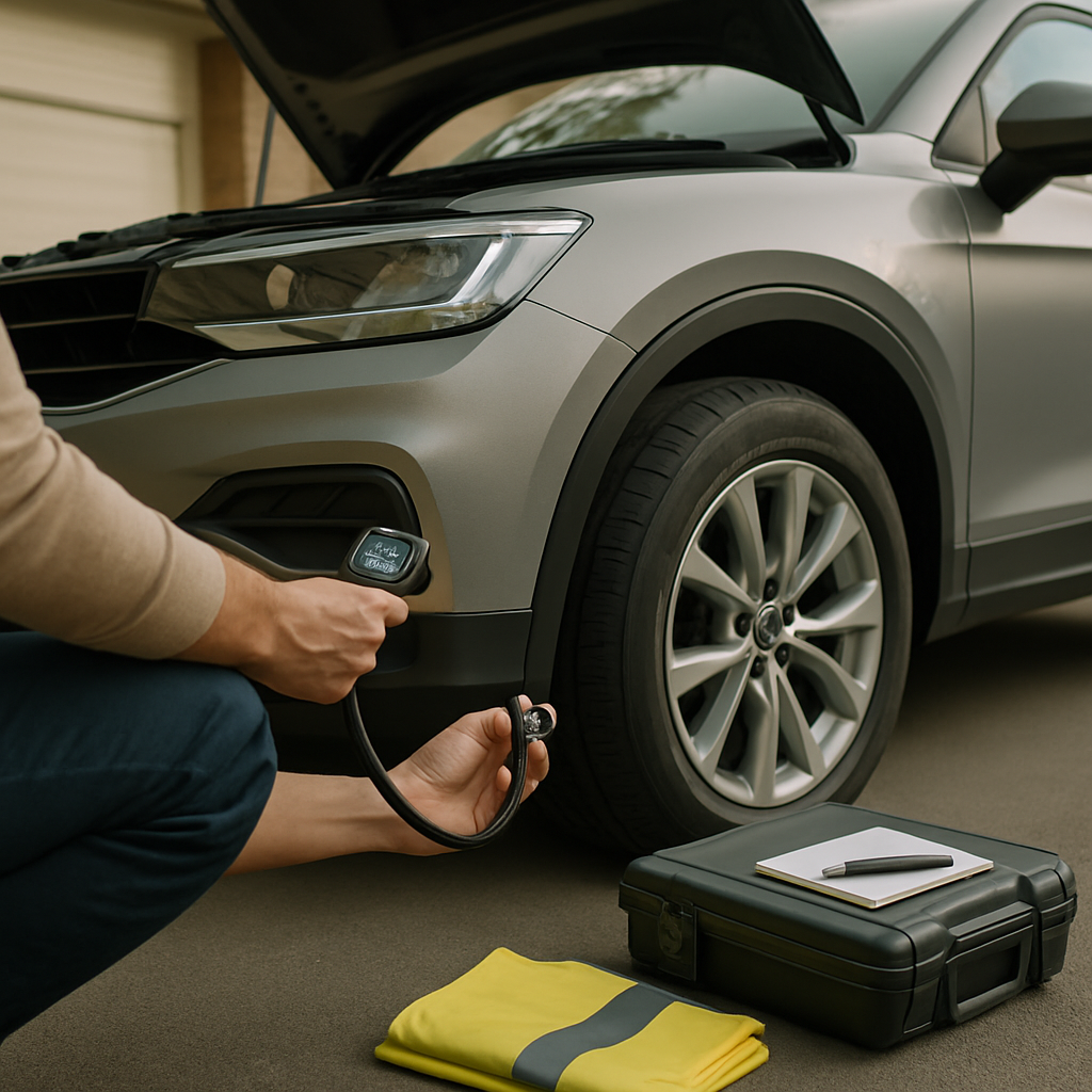 • Notfallausrüstung kontrollieren: Pannendreieck, Warnweste, Verbandkasten, Taschenlampe.